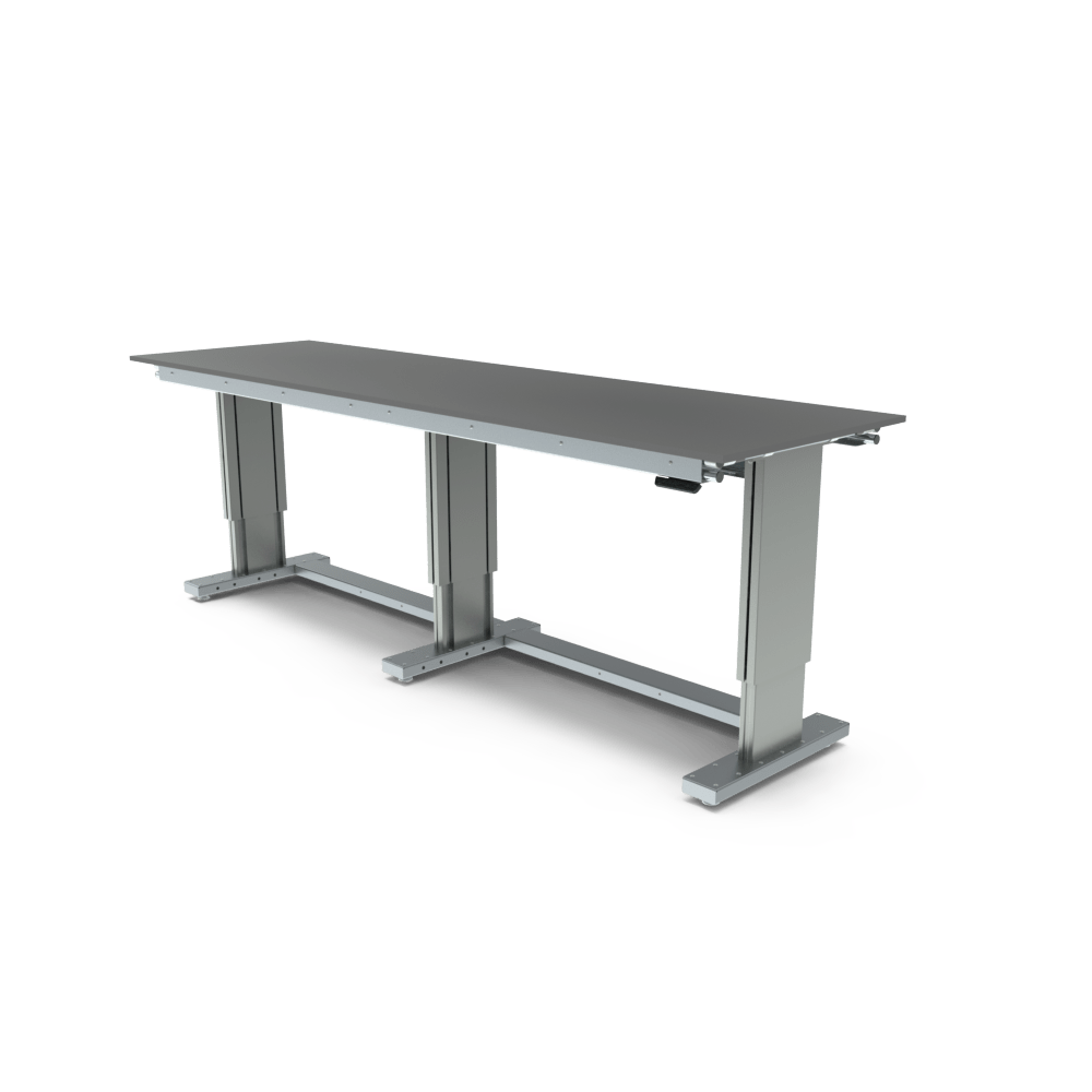 Dank der robusten industriellen Hebesäulen verfügt der Tisch über eine beeindruckende Tragfähigkeit von 350 kg.