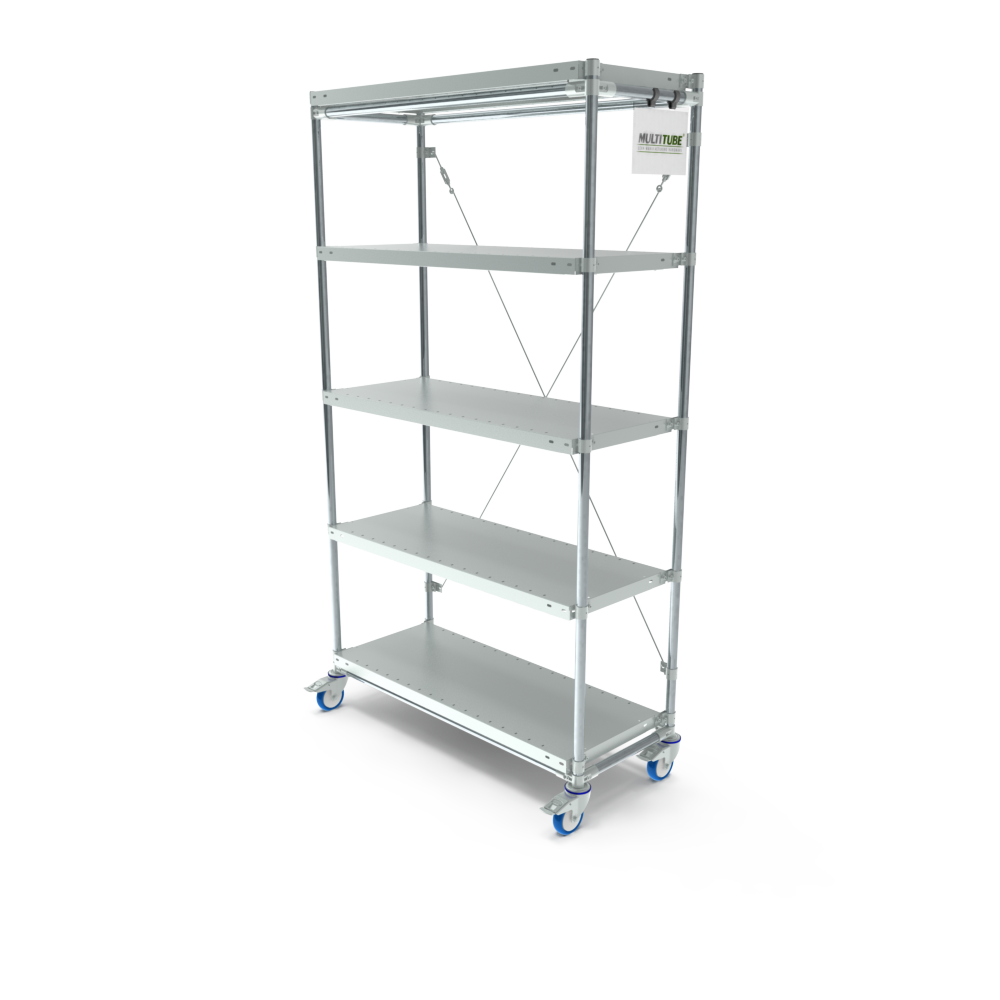Unsere mobilen Regalregale werden standardmäßig mit 5 Regalbrettern geliefert. Die Regalbretter sind 40 mm hoch und können optional mit Etikettenhaltern ausgestattet werden.