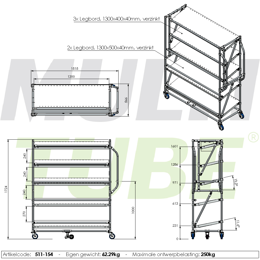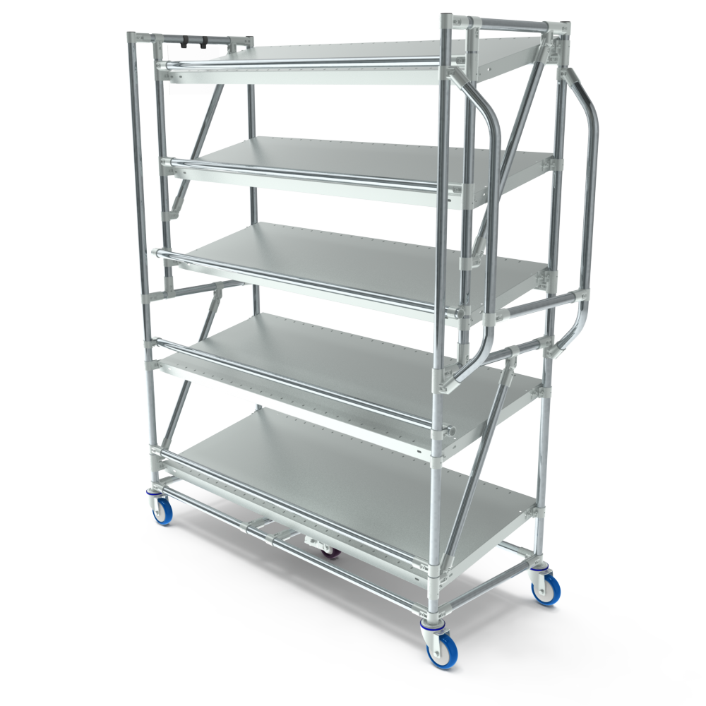 Die stabile Konstruktion ermöglicht den sicheren Transport schwerer Produkte. Außerdem ist der Wagen modular aufgebaut, sodass die Anzahl der Regalbretter einfach angepasst und zusätzliche Zubehörteile, wie Halter für Scanner, Tablets oder Becher, hinzugefügt werden können. So kann der Wagen vollständig an Ihren spezifischen Arbeitsprozess angepasst werden.