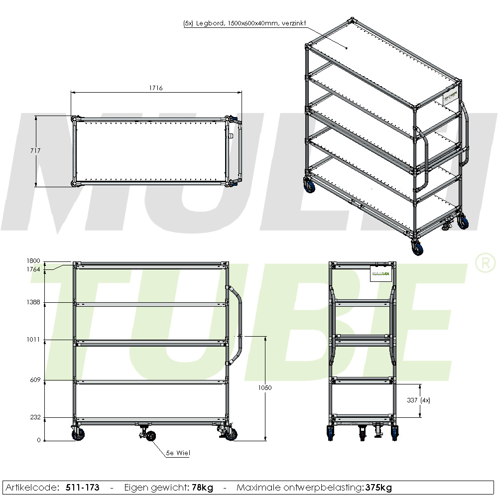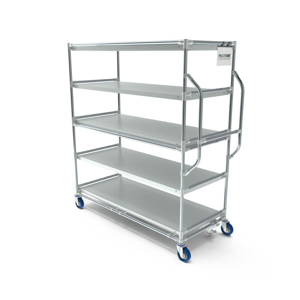 Die stabile Konstruktion ermöglicht den sicheren Transport schwerer Produkte. Außerdem ist der Wagen modular aufgebaut, sodass die Anzahl der Ablageböden einfach angepasst werden kann und zusätzliche Zubehörteile, wie Halterungen für Scanner, Tablets oder Becher, hinzugefügt werden können. So kann der Wagen vollständig auf Ihren spezifischen Arbeitsprozess abgestimmt werden.