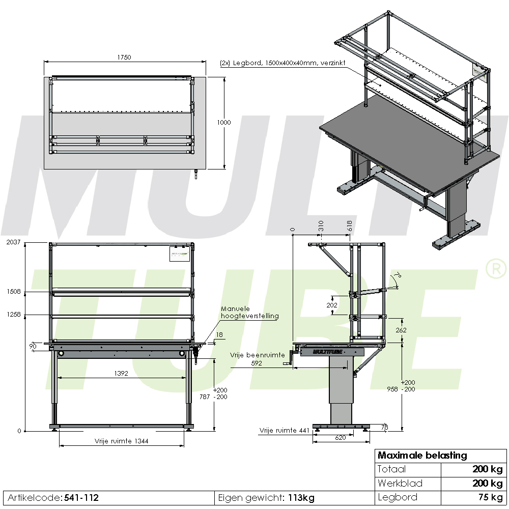 Manuell verstellbare Arbeitsstation, 1750x1000mm