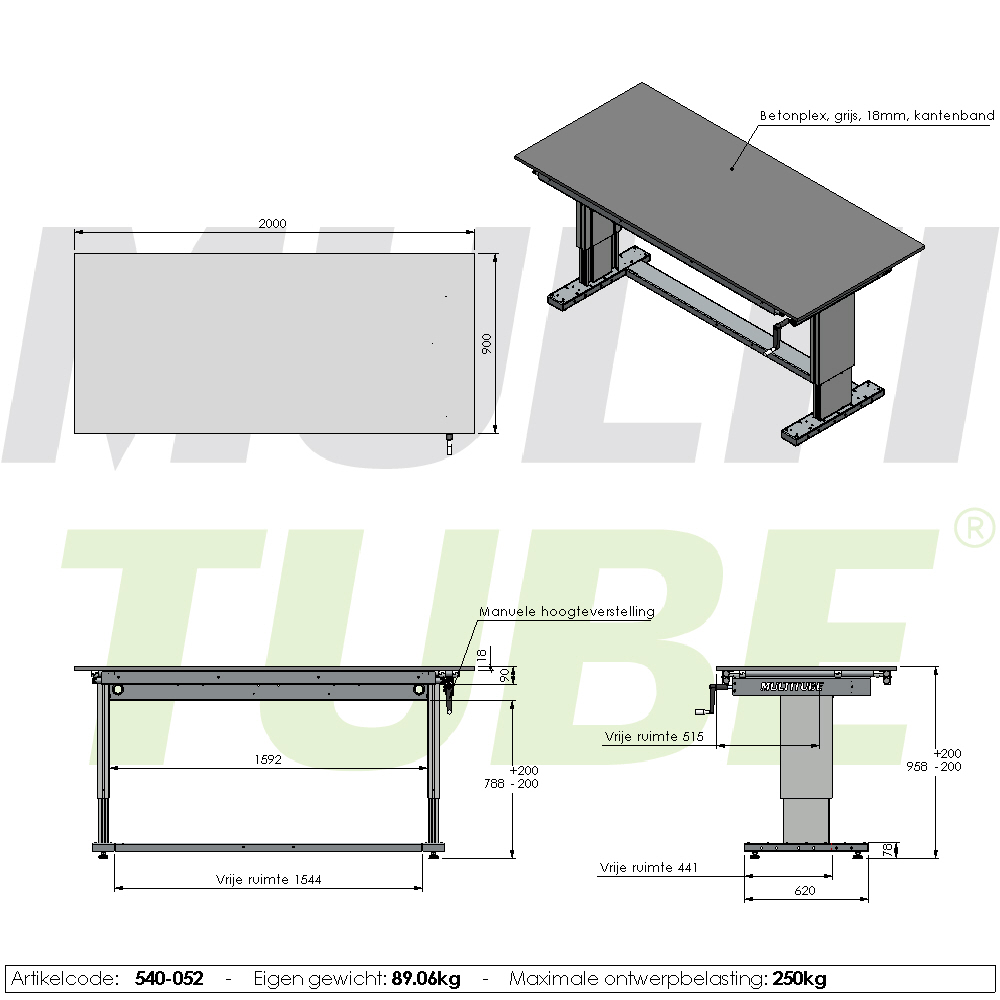 Manuell verstellbarer Arbeitstisch, 2000x900mm
