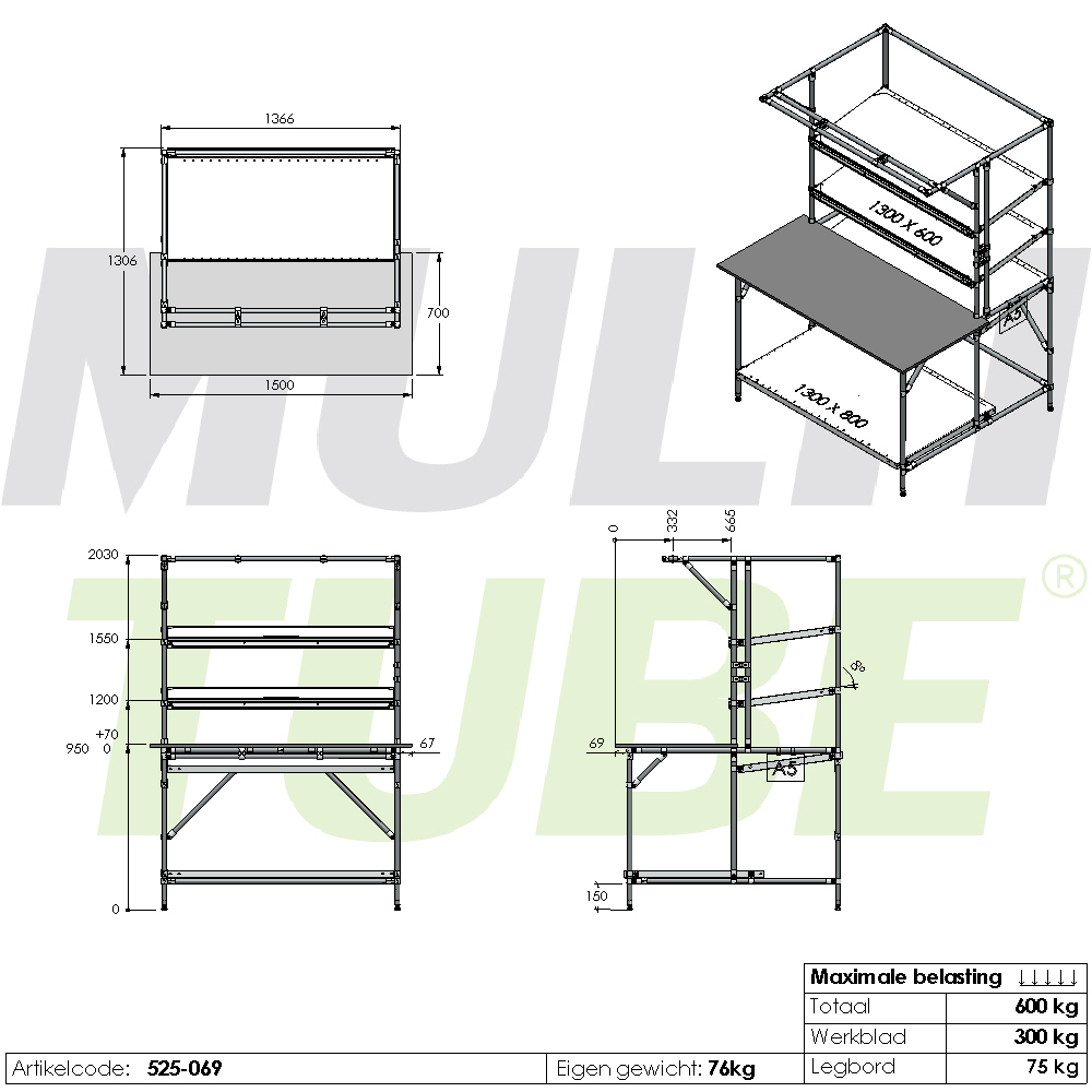 Montagetisch, 1500x700mm, Fachboden 600 mm