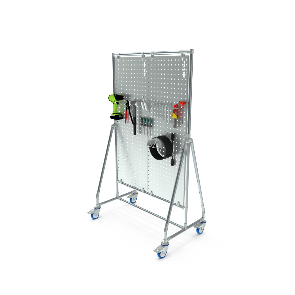 Mit der Werkzeugtafel auf Rädern haben Sie alle Werkzeuge immer und überall in Reichweite. Die stabilen Rahmen mit gebremsten Industrie-Bolzenlochrollen sorgen für optimale Mobilität.