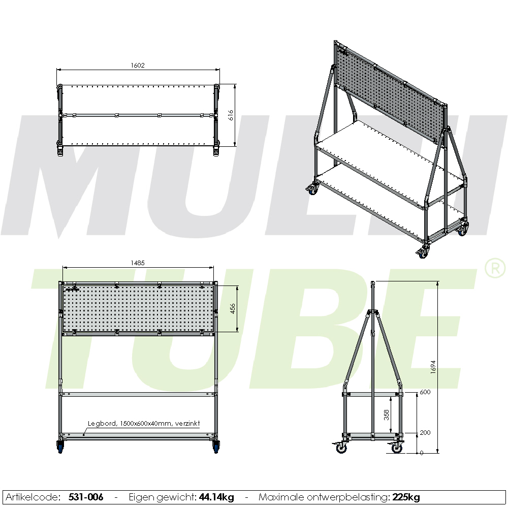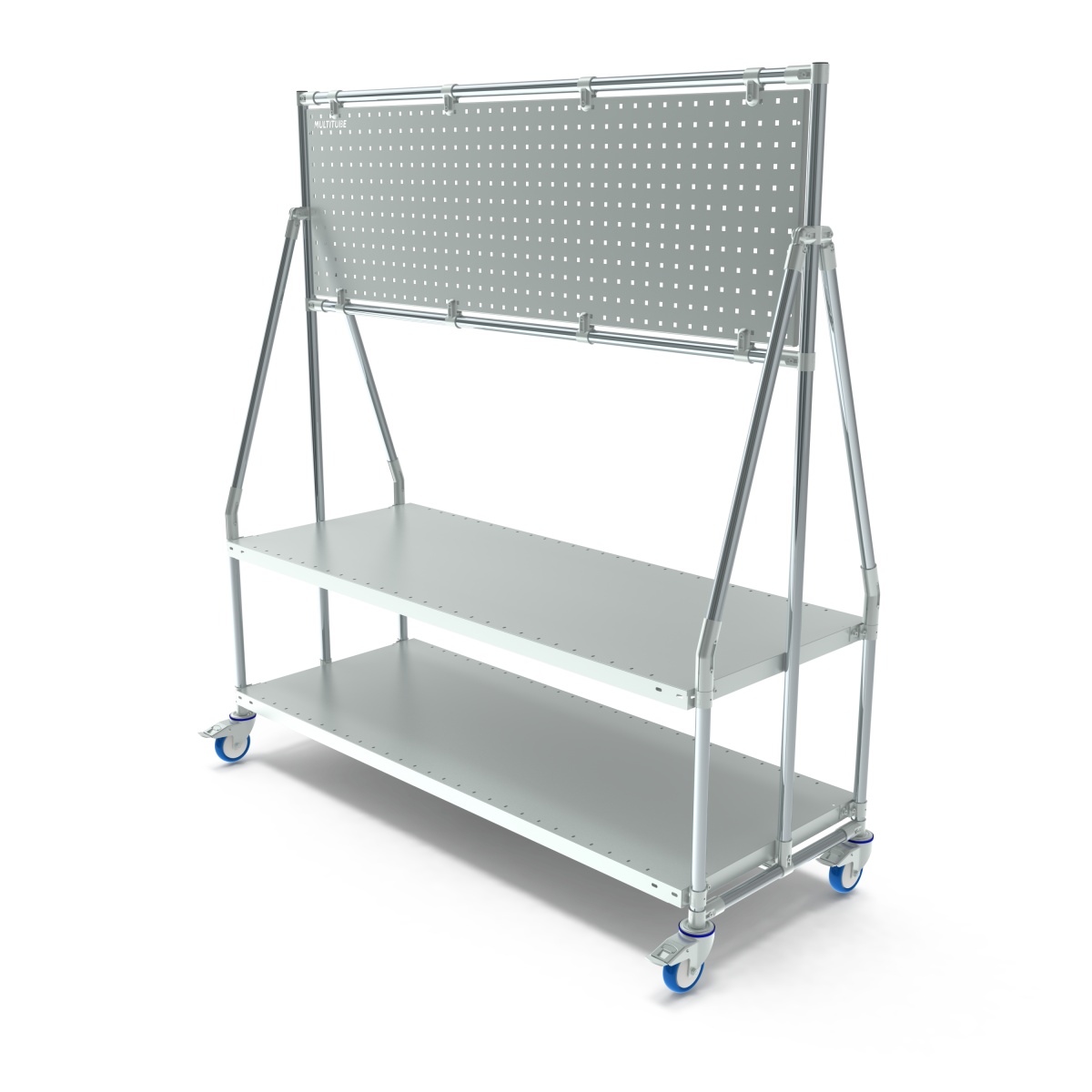Die stabilen Rahmen sind mit gebremsten, kugelgelagerten Industrierollen ausgestattet. Das Gestell ist mit Rohrverbindern und Edelstahlrohr konstruiert.