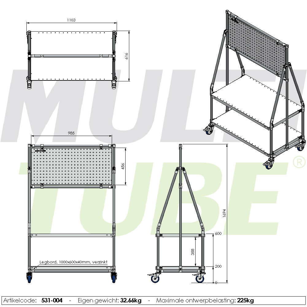 Die stabilen Rahmen sind mit gebremsten, kugelgelagerten Industrierollen ausgestattet. Der Rahmen ist mit Rohrverbindern und Edelstahlrohr konstruiert.