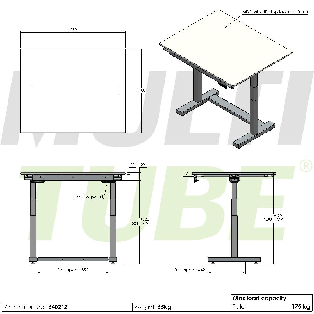 With the control panel and memory function, you can easily set your ideal working height. The worktop has an adjustment range of 650 mm, allowing heights between 768 mm and 1418 mm, so you can adapt the table to different users and working positions.