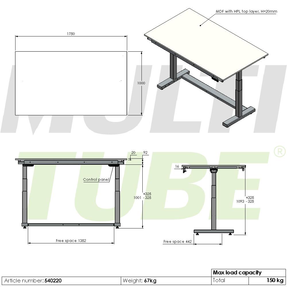 Electric height adjustable workbench, 1750x1000mm