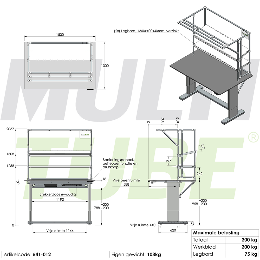 Thanks to the robust industrial lifting columns, the workstation offers an impressive load capacity of 300 kg, including shelves. For even greater convenience, the workstation is equipped with two shelves (each supporting up to 75 kg) and an integrated 6-way power strip.