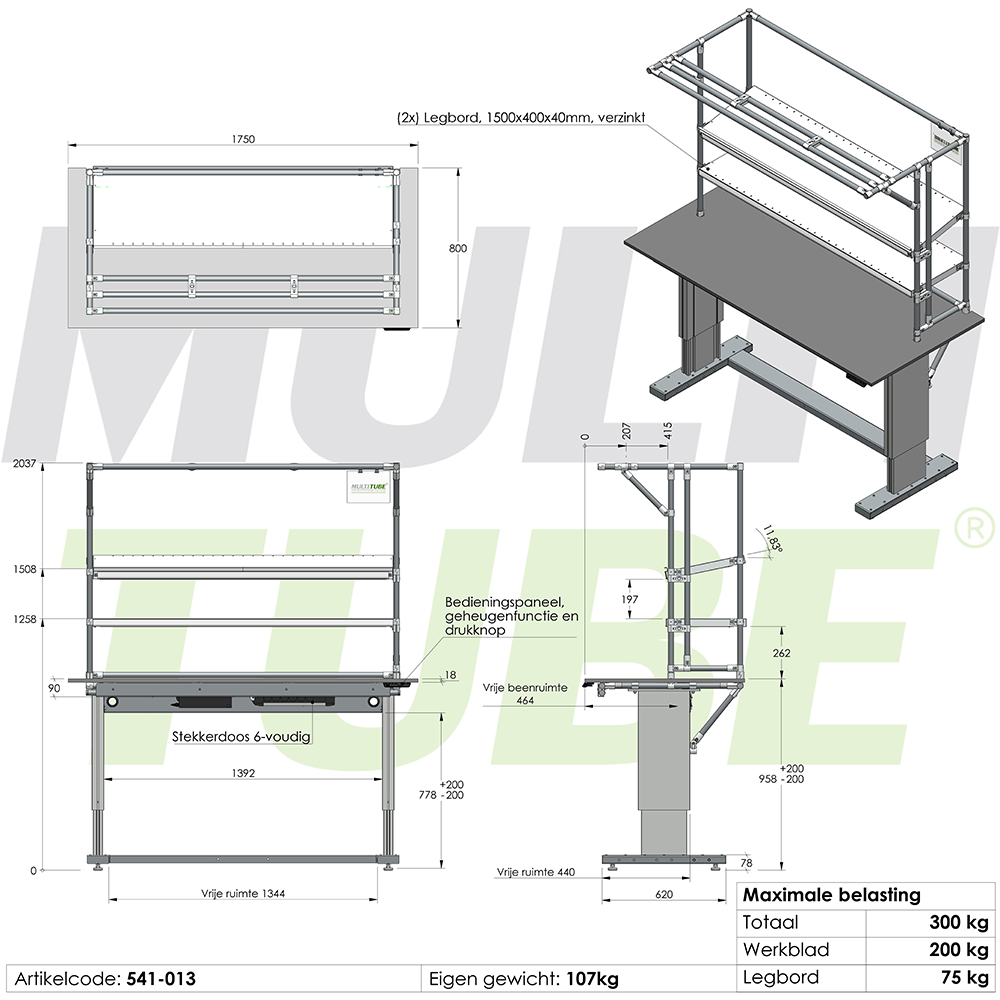 Thanks to the robust industrial lifting columns, the workstation offers an impressive load capacity of 300 kg, including shelves. For even greater convenience, the workstation is equipped with two shelves (each supporting up to 75 kg) and an integrated 6-way power strip.