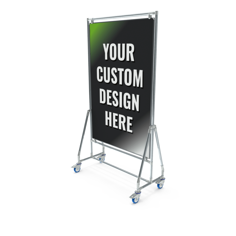 Mobile whiteboard with magnetic lacquered steel writing surface and aluminium frame. Both the front and back can be printed.