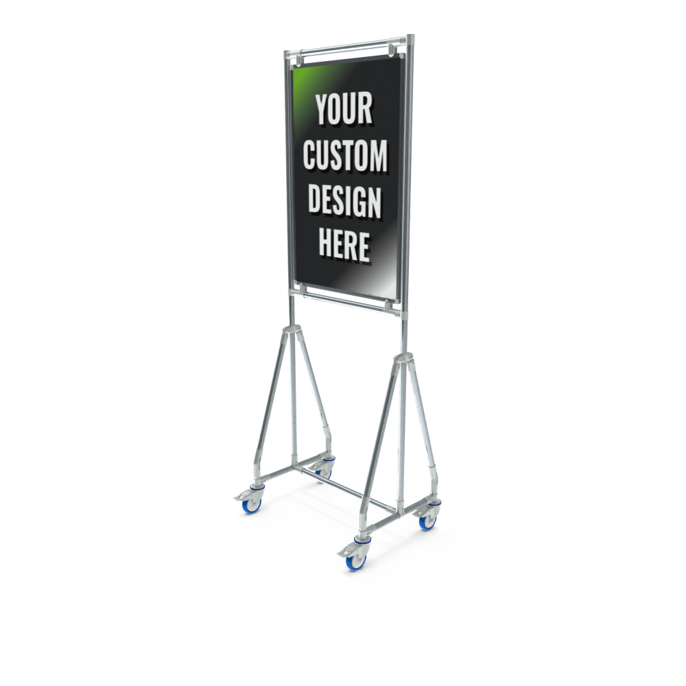 Mobile whiteboard with magnetic lacquered steel writing surface and aluminium frame. Both the front and back can be printed.