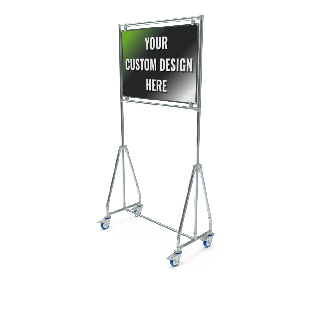 Mobile whiteboard with magnetic lacquered steel writing surface and aluminium frame. Both the front and back can be printed.