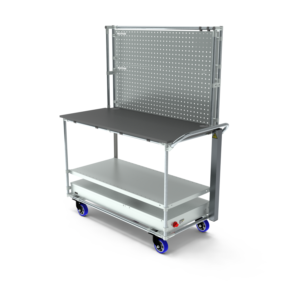 The base model of the mobile workstation features a shelf for storing products, materials and other supplies. Thanks to its modular design, you can easily add additional accessories, allowing you to adapt the workstation to your specific needs. Moreover, the workstation is equipped with four plate wheels and a fifth wheel for easy movement.