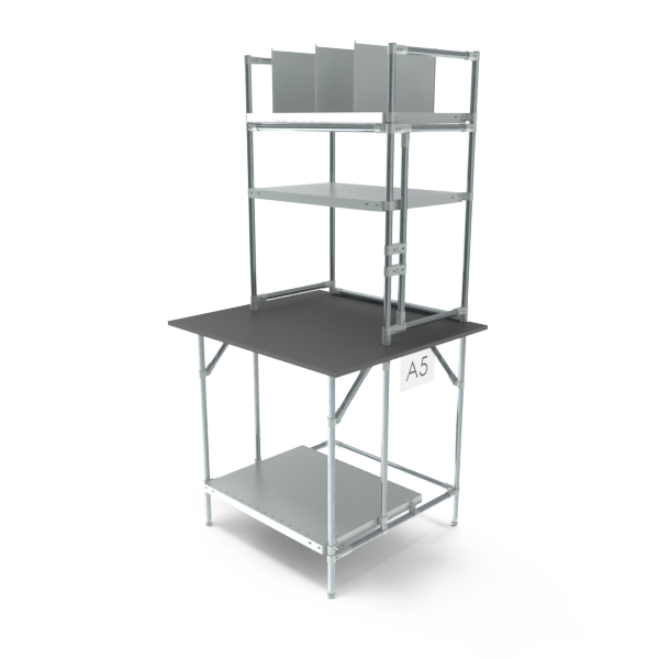 Both above and below the worktop, you’ll find a strong shelf, ideal for storing boxes, bins, and other supplies. You can easily add multiple extra shelves for even more storage capacity. Each shelf can support up to 75 kilos, ensuring safe storage of components, tools, or packaging materials while keeping your workspace organised.