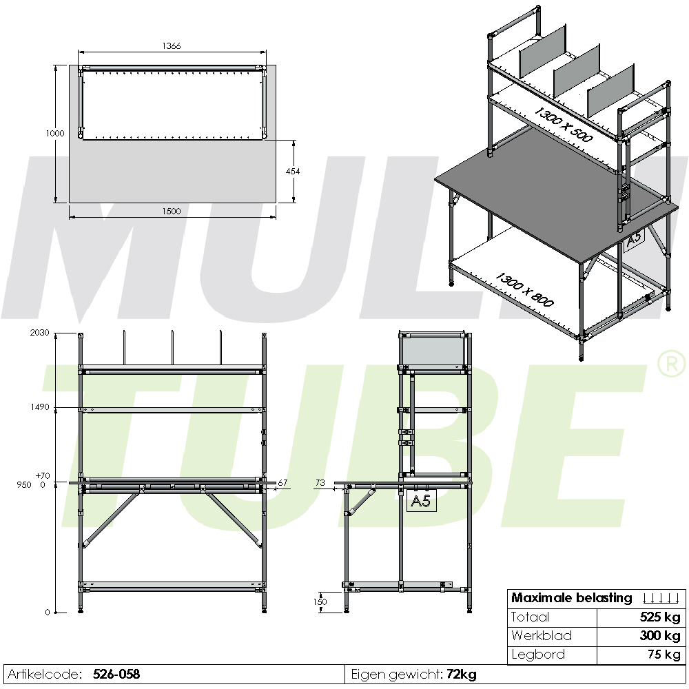 Both above and below the worktop, you’ll find a strong shelf, ideal for storing boxes, bins, and other supplies. You can easily add multiple extra shelves for even more storage capacity. Each shelf can support up to 75 kilos, ensuring safe storage of components, tools, or packaging materials while keeping your workspace organised.