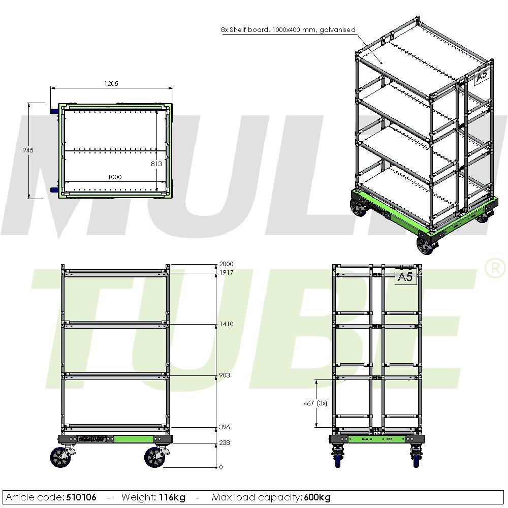 With its high load capacity and ultra-robust design, this shelf cart offers maximum stability, even under heavy loads. The multiple shelves provide clear organisation and an efficient layout of materials, making your transport or order-picking process not only safer but also faster. Thanks to our modular Tube & Joint system, the shelves can easily be positioned at an angle.