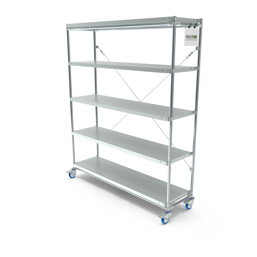 Our mobile shelving units come standard with five shelves. The shelves are 40 mm high and can optionally be equipped with label holders.