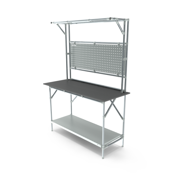 Onder het werkblad vind je een stevig legbord, met de mogelijkheid om meerdere extra legborden toe te voegen. Elk legbord kan tot 75 kilo dragen, waardoor je eenvoudig onderdelen, gereedschappen of verpakkingsmateriaal kunt opbergen.