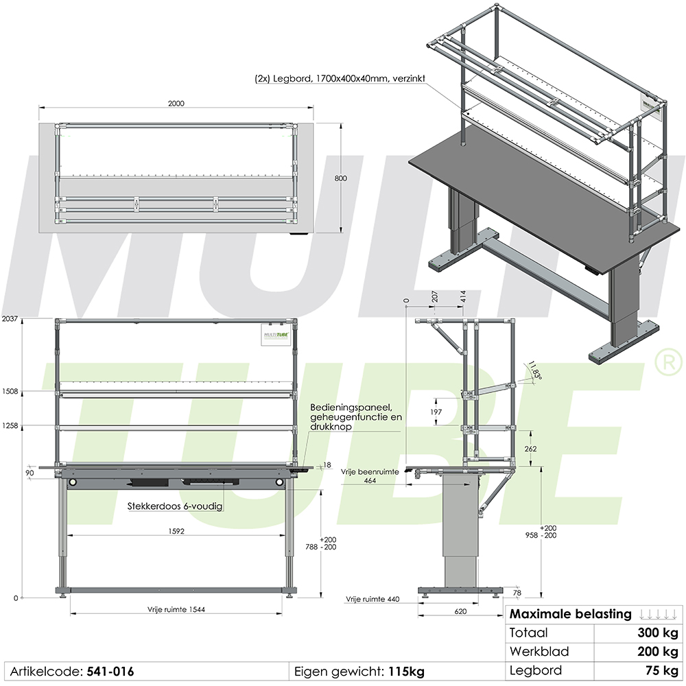 Dankzij de robuuste industriële hefkolommen beschikt de tafel over een indrukwekkend draagvermogen van 300 kg, inclusief legborden. Voor nog meer gebruiksgemak is het werkstation uitgerust met twee legborden (elk belastbaar tot 75 kg) en een geïntegreerde 6-voudige stekkerdoos.