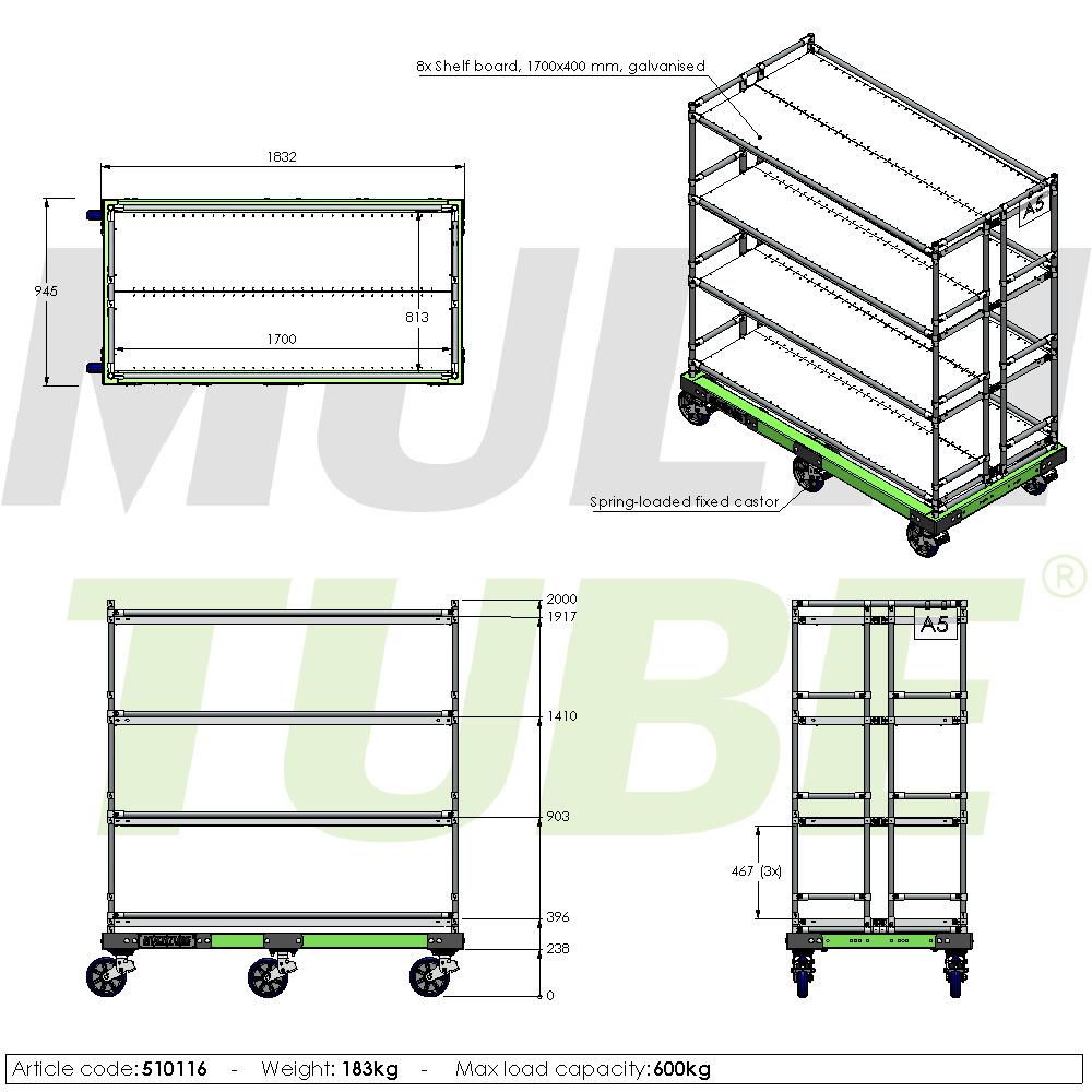 Met zijn hoge draagvermogen en super robuuste bouw biedt deze etagewagen maximale stabiliteit, ook bij zware ladingen. De meerdere etages zorgen voor overzicht en een georganiseerde indeling van materialen, zodat je transport- of orderpickproces niet alleen veiliger, maar ook sneller verloopt. Dankzij ons modulaire Tube & Joint systeem zijn de legborden eenvoudig onder een hoek te plaatsen.