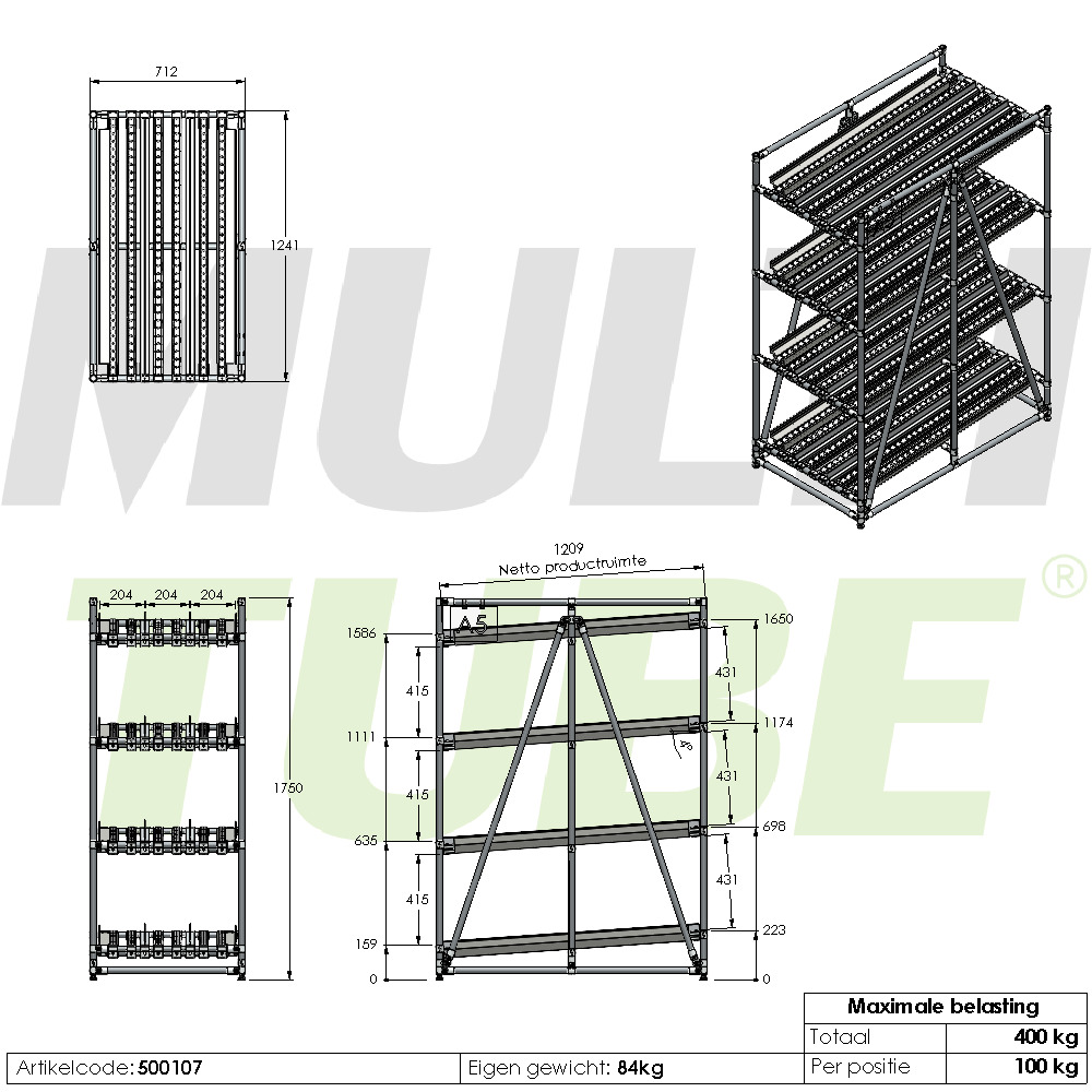 Deze doorrolstelling beschikt over drie lanes, waardoor er drie bakken naast elkaar per lane geplaatst kunnen worden. Met een maximale belasting van 400 kg en een draagvermogen van 100 kg per niveau is het flowrack stevig, betrouwbaar en klaar voor intensief gebruik. Voor extra flexibiliteit is dit flowrack uitgevoerd op wielen.