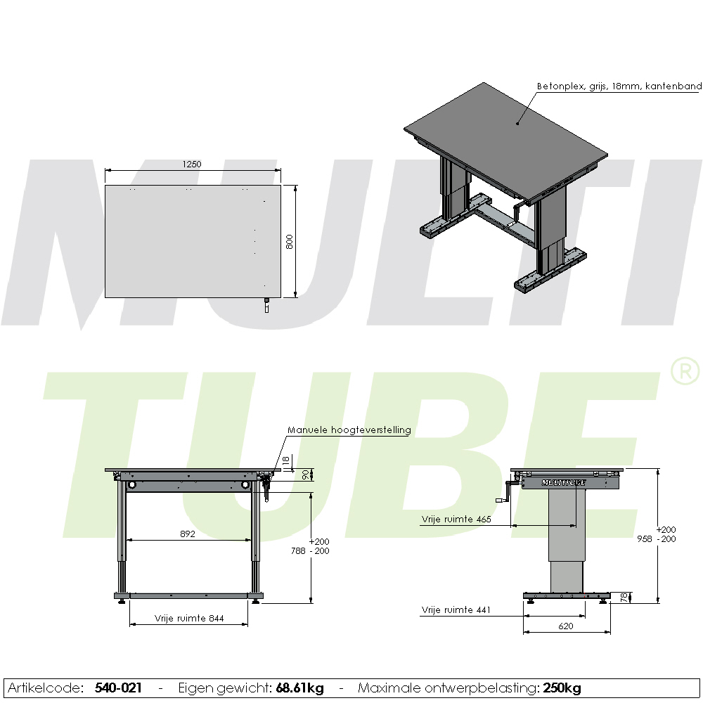 Combineer comfort en flexibiliteit met onze manueel verstelbare werktafel. Het 18 mm dikke betonplex werkblad biedt een sterke en betrouwbare basis voor diverse werkzaamheden. Dankzij de afwerking met kantenband heeft het blad geen scherpe randen.