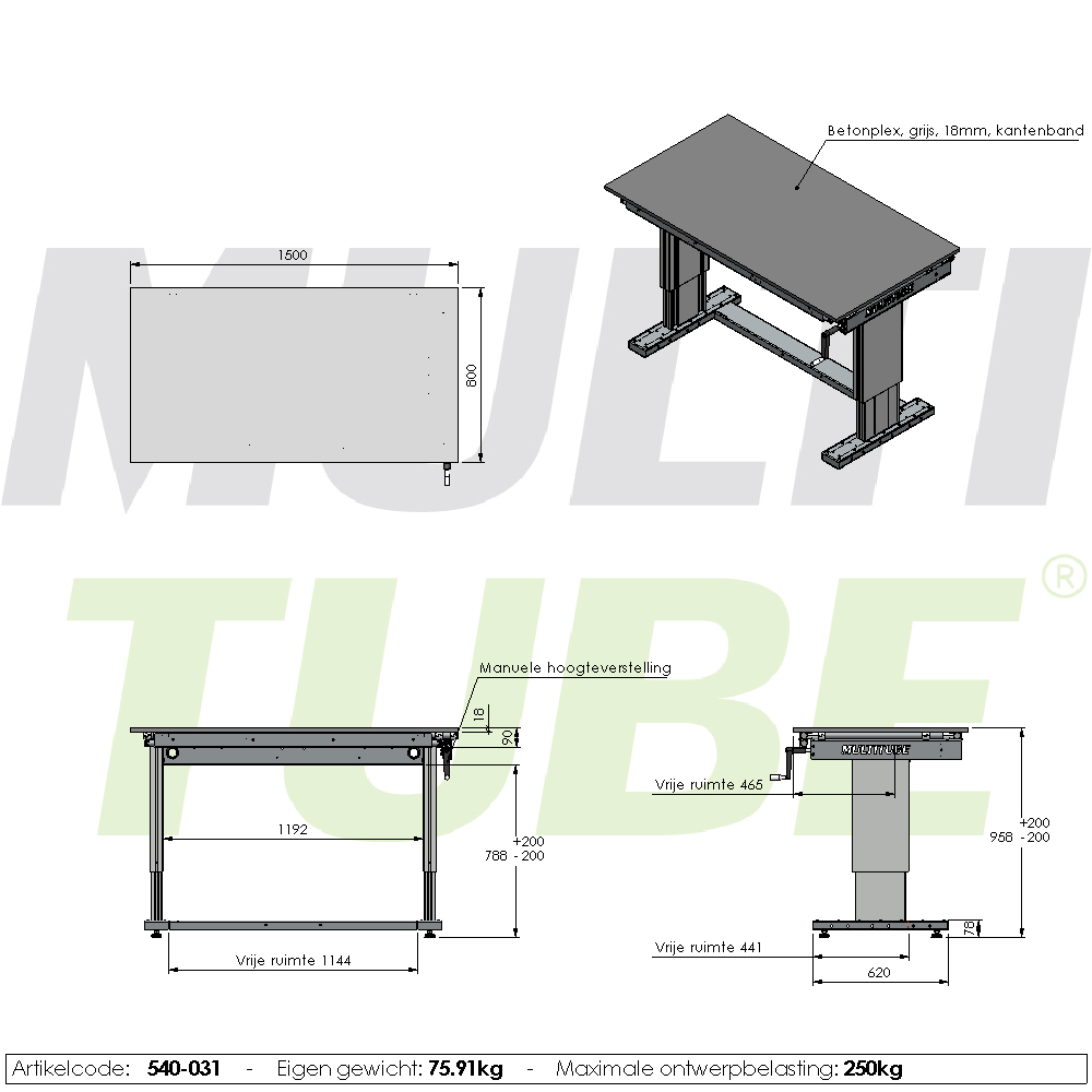 Combineer comfort en flexibiliteit met onze manueel verstelbare werktafel. Het 18 mm dikke betonplex werkblad biedt een sterke en betrouwbare basis voor diverse werkzaamheden. Dankzij de afwerking met kantenband heeft het blad geen scherpe randen.