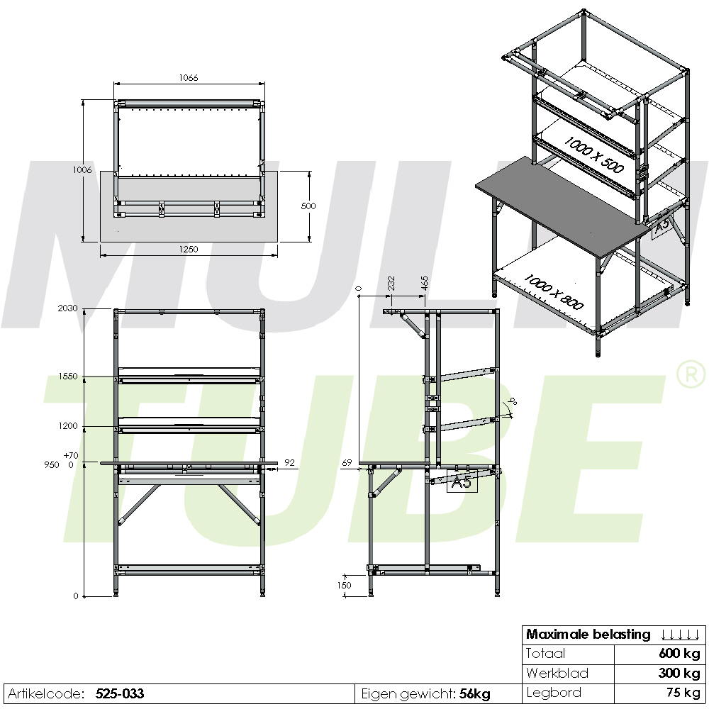 Montagetafel, 1250x500mm, legbord 500 mm