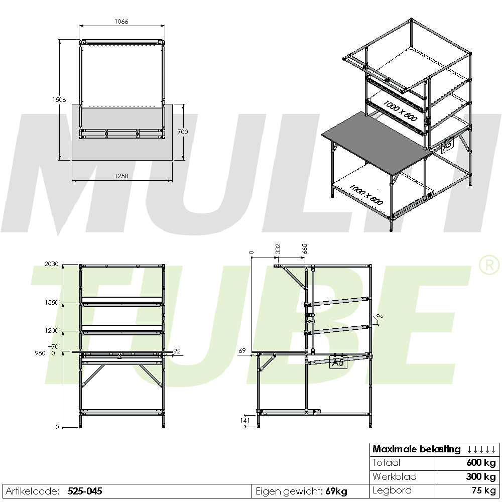 Montagetafel, 1250x700mm, legbord 800 mm
