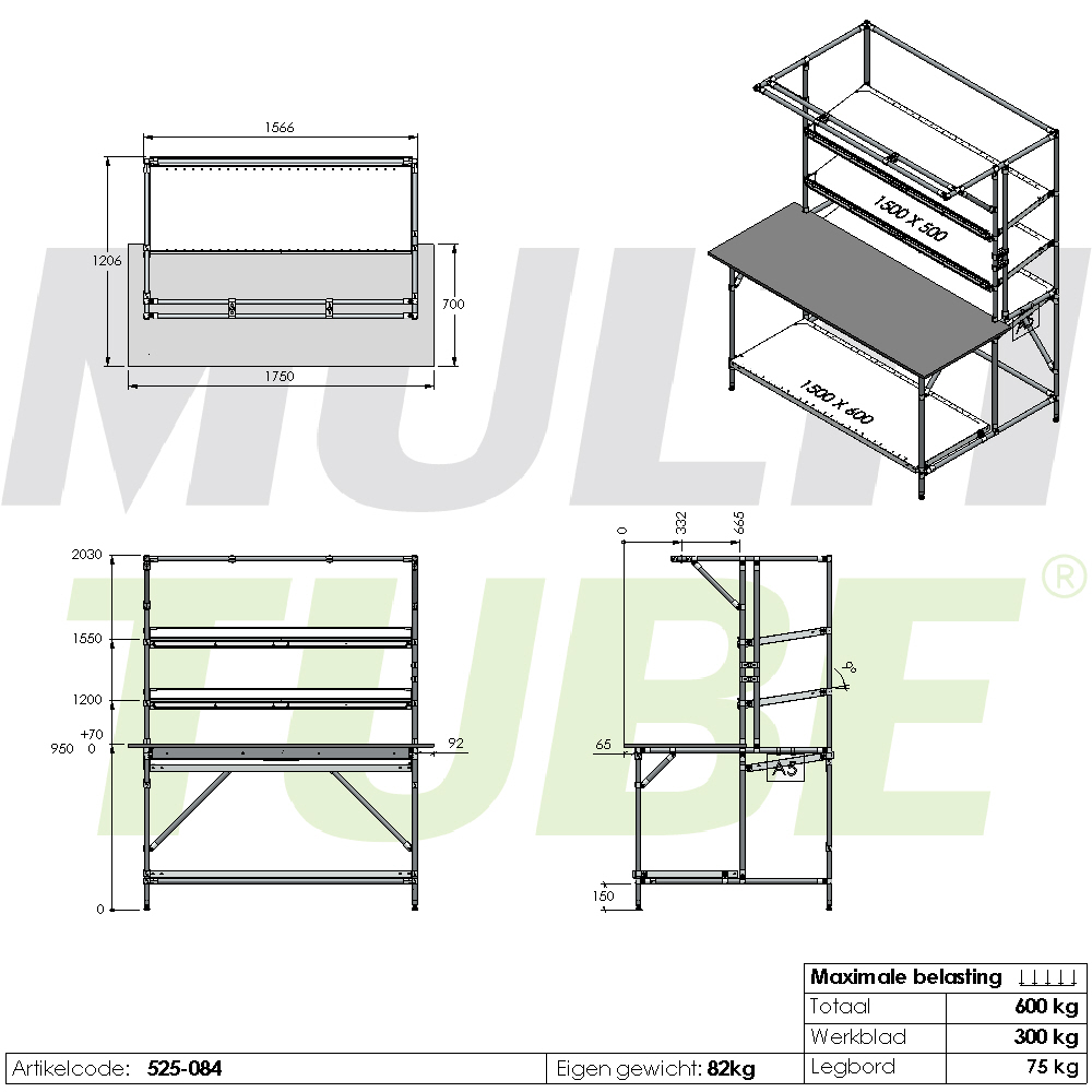 Montagetafel, 1750x700mm, legbord 500 mm