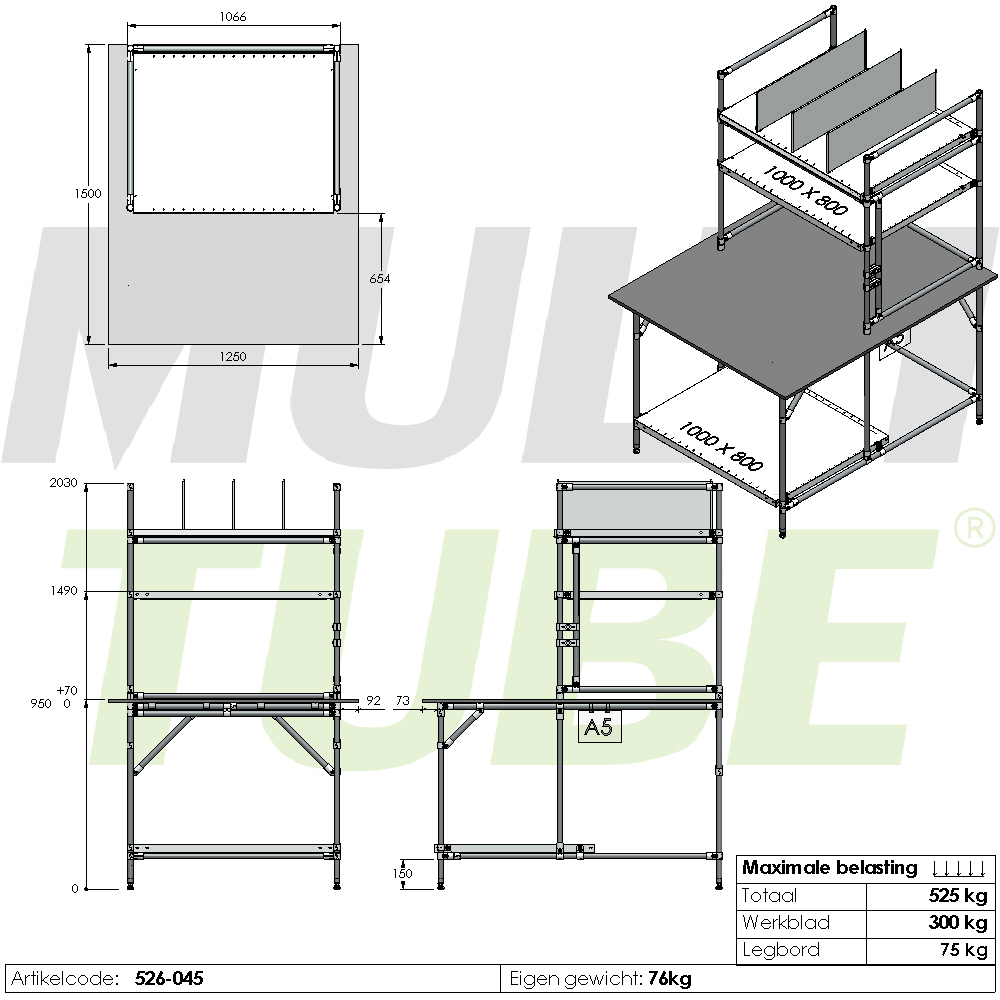 Paktafel, 1250x1500mm, legbord 800 mm