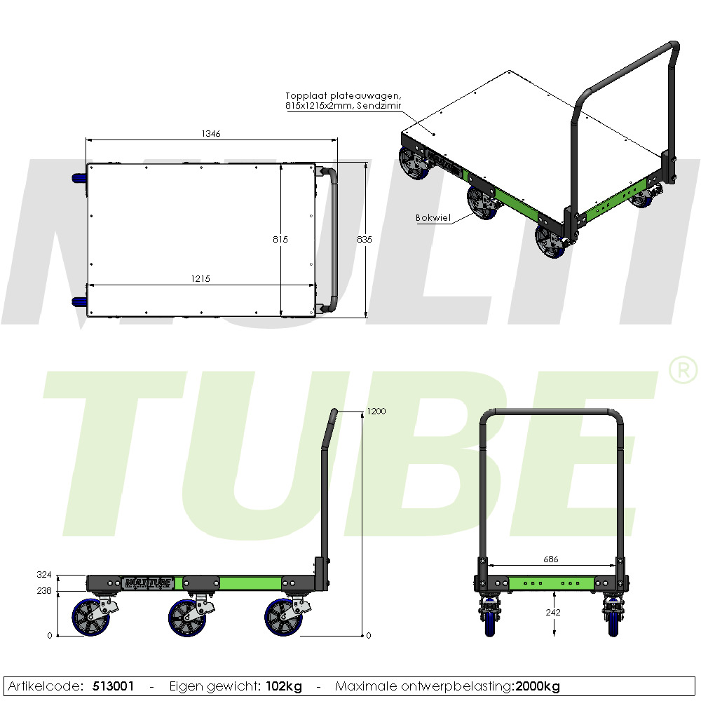 Met zijn hoog draagvermogen en super robuuste bouw biedt deze plateauwagen maximale stabiliteit, ongeacht het gewicht of formaat van de lading. Het open plateau maakt het eenvoudig om grote, zware of onregelmatig gevormde producten snel en overzichtelijk te vervoeren.