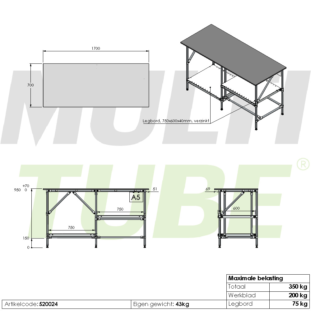 Het werkblad heeft een draagvermogen van 300 kilogram en is bestand tegen intensief dagelijks gebruik. Onder het werkblad vind je stevige legborden, met de mogelijkheid om meerdere extra legborden toe te voegen. Elk legbord kan tot 75 kilo dragen, waardoor je eenvoudig onderdelen, gereedschappen of verpakkingsmateriaal kunt opbergen.