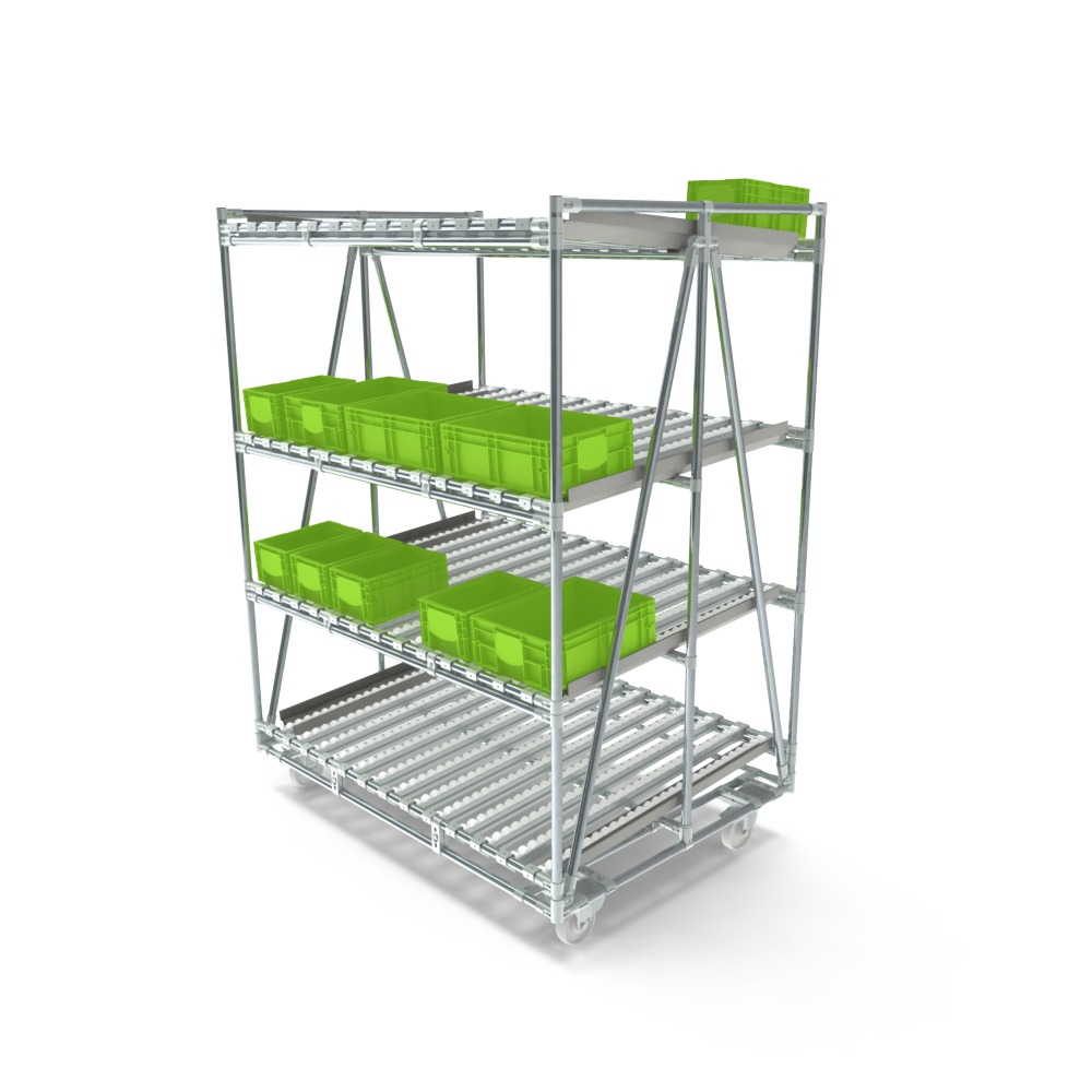 Standardowo regał dostarczany jest z 3 poziomami załadunku i 1 poziomem zwrotnym, każdy wyposażony w płaskie szyny rolkowe bez przegrodzeń. Tworzy to ciągły tor rolkowy zapewniający płynny i niezawodny transport pojemników.