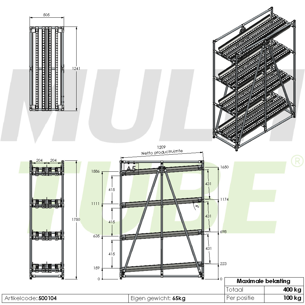 Ten regał przepływowy posiada jeden tor (lane), co pozwala ustawić kilka pojemników jeden za drugim. Z maksymalnym obciążeniem 400 kg i nośnością 100 kg na poziom, regał jest stabilny, niezawodny i gotowy do intensywnego użytkowania.