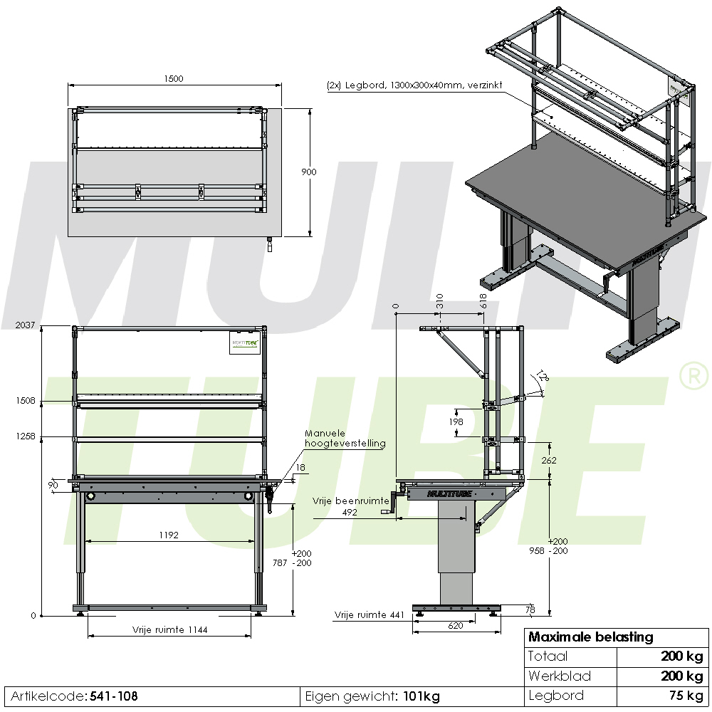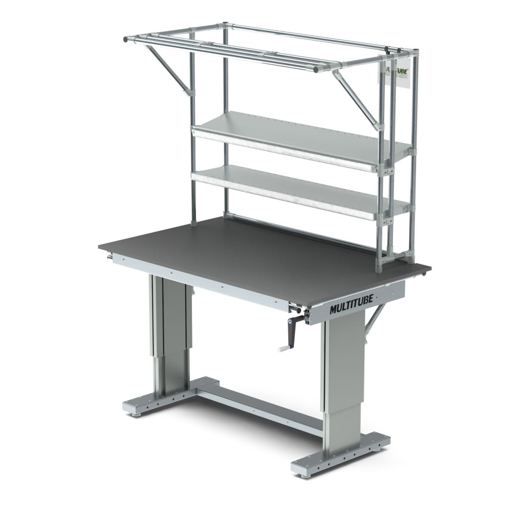 Dzięki wytrzymałym przemysłowym kolumnom podnoszącym ręcznie regulowane stanowisko robocze oferuje nośność do 300 kg, łącznie z półkami. Dla jeszcze większej funkcjonalności stanowisko robocze zostało wyposażone w dwie półki każda o nośności do 75 kg oraz zintegrowaną listwę zasilającą z 6 gniazdami.
