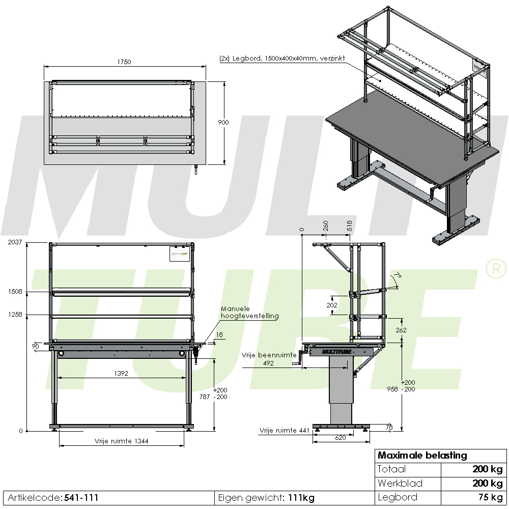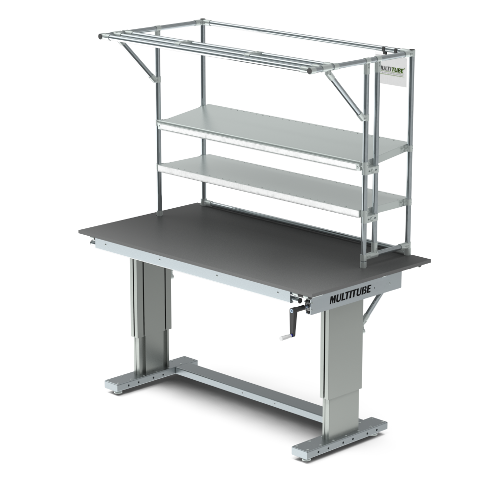 Dzięki wytrzymałym przemysłowym kolumnom podnoszącym ręcznie regulowane stanowisko robocze oferuje nośność do 300 kg, łącznie z półkami. Dla jeszcze większej funkcjonalności stanowisko robocze zostało wyposażone w dwie półki każda o nośności do 75 kg oraz zintegrowaną listwę zasilającą z 6 gniazdami.