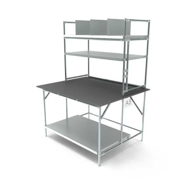 Pod i nad blatem znajduje się solidna, idealna do przechowywania pudełek, pojemników i innych niezbędnych przedmiotów. Można łatwo dodać dodatkowe półki, aby zwiększyć przestrzeń magazynową. Każda półka wytrzymuje do 75 kg, co pozwala bezpiecznie przechowywać części, narzędzia lub materiały opakowaniowe, zachowując porządek na stanowisku pracy.