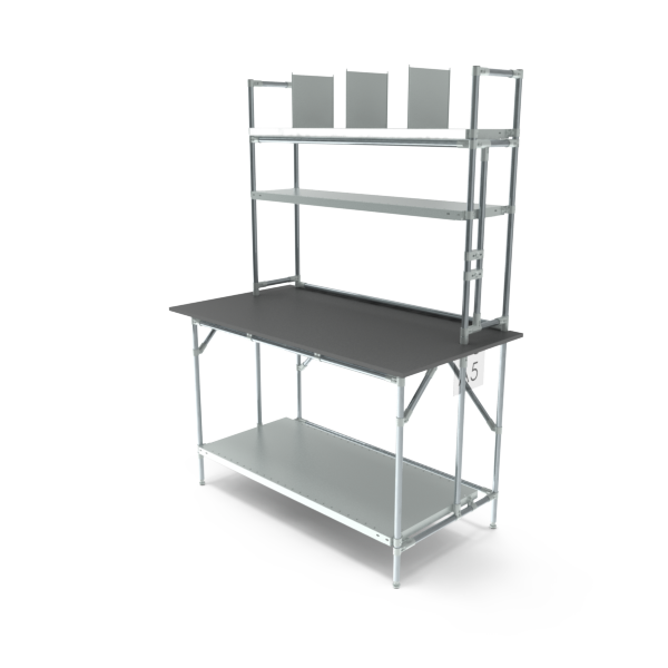 Pod i nad blatem znajduje się solidna, idealna do przechowywania pudełek, pojemników i innych niezbędnych przedmiotów. Można łatwo dodać dodatkowe półki, aby zwiększyć przestrzeń magazynową. Każda półka wytrzymuje do 75 kg, co pozwala bezpiecznie przechowywać części, narzędzia lub materiały opakowaniowe, zachowując porządek na stanowisku pracy.