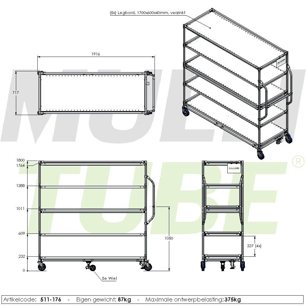 Wózek do kompletacji zamówień, 1700x600mm, koło piąte